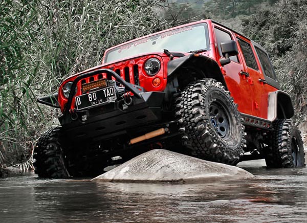 Berdasarkan alasan itulah Dadi memodifikasi JK Wrangler miliknya dan dijadikan contoh. "Awalnya saya memasang pelek besar yang dipadukan ban profil kasar dan penggantian bumper serta engine hood AEV (American Expedition Vehicle), kemudian diikuti dengan suspension kit dan air locker," paparnya.