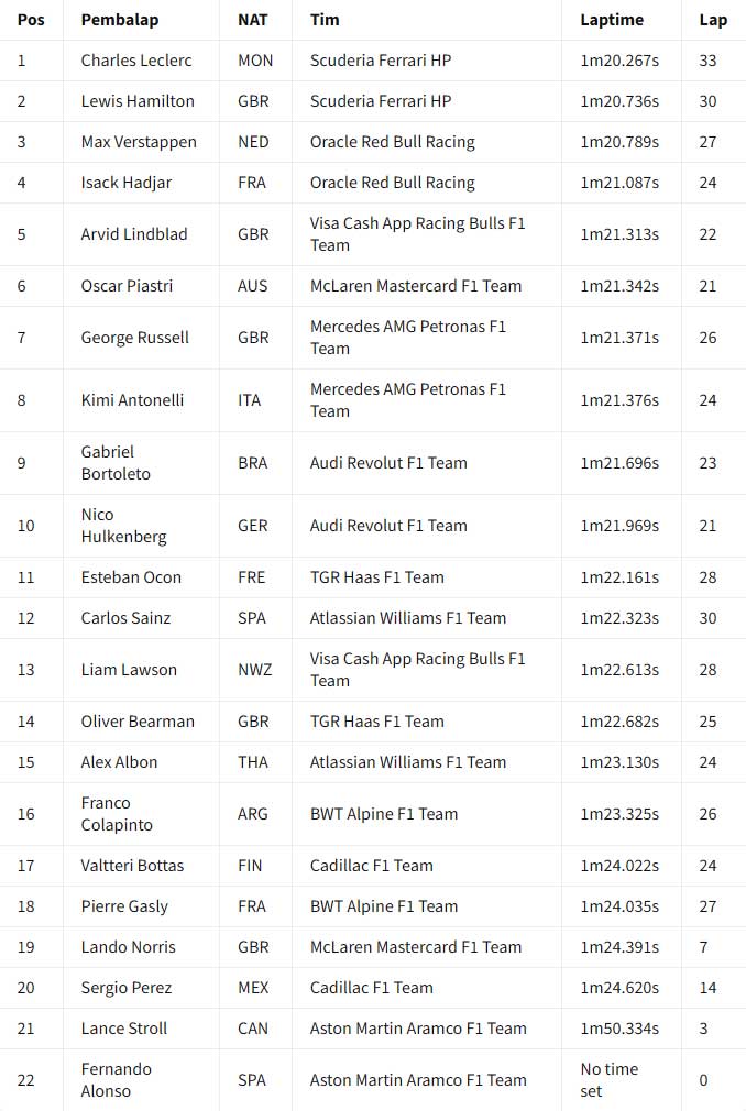 ![]() Charles Leclerc memimpin sesi pertama di musim Formula 2026 di Grand Prix Australia, mengungguli rekan setimnya Lewis Hamilton dalam sesi di mana masalah keandalan melanda beberapa tim. Leclerc mencatatkan laptime 1m20,767s di menit-menit akhir, menempatkannya unggul 0,469 detik di depan Hamilton, menempatkan Ferrari 1-2 dalam sesi pertama di Albert Park. Red Bull menjadi ancaman terbesar sepanjang sesi satu jam tersebut, dengan Max Verstappen berada di posisi ketiga tercepat, diikuti rekan setim barunya Isack Hadjar dan rookie Racing Bulls, Arvid Linblad. Oscar Piastri berada di posisi keenam tercepat saat McLaren berjuang dengan masalah keandalan, yang memaksa kedua pebalap kembali ke pit. Namun, saat Piastri kembali beraksi, Norris tertahan di garasi saat tim menyelidiki potensi masalah girboks, sehingga ia berada di posisi ke-19 tanpa catatan waktu yang representatif. Pasangan Mercedes dan Audi melengkapi 10 besar, dengan George Russell memimpin kuartet tersebut. Sesuai dugaan, Aston Martin tidak melakukan banyak lap pada sesi Jumat pagi di Albert Park, yang disebabkan oleh masalah vibrasi dengan Power Unit Honda. Fernando Alonso sama sekali tidak turun ke trek, sementara Lance Stroll hanya menyelesaikan satu kali percobaan sebelum mengakhiri waktunya di lintasan, hal ini menimbulkan pertanyaan tentang kemampuan tim untuk mencapai garis finis pada hari Minggu. Williams Racing juga menghadapi persoalan keandalan selama sesi berlangsung. Tim asal Inggris tersebut harus berurusan dengan gangguan teknis yang memengaruhi performa mobil di lintasan, sehingga salah satu pebalapnya tidak dapat menyelesaikan sesi seperti yang diharapkan. Masalah tersebut dialami oleh Alex Albon yang terpaksa menghentikan mobilnya di tengah sesi. Situasi itu terjadi secara tiba-tiba ketika mobil yang dikendarainya mengalami penurunan performa akibat gangguan pada sistem penting kendaraan. Gangguan yang muncul berkaitan dengan hilangnya tekanan pada sistem hidrolik. Kondisi ini membuat beberapa komponen mobil tidak dapat bekerja secara normal, sehingga Albon tidak memiliki pilihan selain menghentikan mobilnya demi mencegah kerusakan yang lebih serius. Salah satu dampak paling terasa dari kehilangan tekanan hidrolik tersebut adalah matinya sistem power steering. Tanpa bantuan kemudi tersebut, mobil menjadi jauh lebih sulit dikendalikan, terutama pada kecepatan tinggi yang biasa terjadi dalam sesi Formula 1. Akibat kejadian itu, sesi Albon pun harus berakhir lebih cepat dari yang direncanakan. Insiden tersebut menambah daftar tantangan yang dihadapi Williams, sekaligus menunjukkan bahwa aspek keandalan tetap menjadi faktor krusial dalam persaingan ketat di lintasan. Hasil FP1 F1 GP Australia 2026 : ![]() Sumber : crash.net