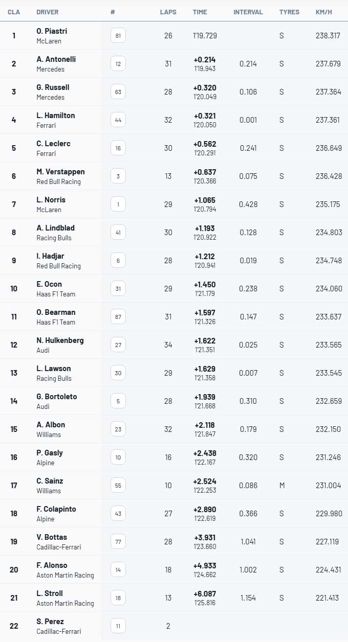 ![]() Aston Martin tertinggal lima detik dari catatan waktu Piastri pada sesi latihan kedua di Melbourne. Pebalap Formula 1 McLaren, Oscar Piastri, memimpin Sesi Latihan Bebas 2 di Grand Prix Australia, mengungguli kedua mobil Mercedes . Lewis Hamilton memimpin di bagian pertama sesi latihan, dengan para pebalap terdepan menggunakan ban keras. Pebalap Ferrari itu mencatatkan waktu 1 menit 20,637 detik, mengungguli Piastri dengan 1 menit 20,638 detik, Kimi Antonelli dengan 1 menit 20,801 detik, George Russell dengan 1 menit 20,984 detik, dan Charles Leclerc dengan 1 menit 21,478 detik. Mercedes kemudian beralih ke ban lunak, dengan Russell mencatatkan waktu 1m20.049s, yang kemudian disalip oleh Antonelli dengan waktu 1m19.943s. Piastri kemudian mencatatkan waktu 1m19.729s, dengan sektor pertama tercepat saja, yang akhirnya menjadi patokan hari itu. Ferrari menempati posisi keempat dan kelima, dengan Hamilton terpaut 0,001 detik dari Russell dan Leclerc terpaut 0,241 detik lagi. Russell mengalami sesi yang penuh gejolak saat ia bertabrakan dengan Arvid Lindblad di pitlane, sedang diselidiki karena pelanggaran start latihan, dan tergelincir ke area kerikil di Tikungan 3 – tetapi hal yang sama juga dialami oleh para pebalap Ferrari. ![]() Red Bull tertinggal 0,637 detik dari waktu tercepat, dengan Max Verstappen mencatatkan waktu 1m20.366s sebelum melebar di tikungan ke-10; puing-puing beterbangan dari RB22-nya saat ia melaju di jebakan kerikil. Sesi ini cukup sulit bagi juara dunia empat kali tersebut, yang menghabiskan 25 menit pertama di luar lintasan setelah berhenti di ujung pitlane karena masalah teknis. Pebalap baru Red Bull, Isack Hadjar, enam persepuluh detik lebih lambat dari rekan setimnya; keduanya dipisahkan oleh juara dunia bertahan Lando Norris dan Lindblad, yang memimpin barisan tengah dengan catatan waktu 1 menit 20,922 detik bersama Racing Bulls . Haas menjadi tim tercepat keenam dengan Esteban Ocon mencatatkan waktu 1m21.179s; Nico Hulkenberg memberi Audi waktu 1m21.351s. Williams dan Alpine jauh lebih lambat, kemudian diikuti oleh tim-tim yang biasa berada di bagian bawah klasemen. Cadillac tertinggal hampir empat detik dari waktu tercepat bersama Valtteri Bottas ; Sergio Perez hanya menyelesaikan dua lap karena masalah sensor membuatnya berada di garasi hampir sepanjang sesi. Ketika pebalap veteran Meksiko itu akhirnya keluar, ia harus berhenti di lintasan karena diduga mengalami masalah hidrolik. Masalah baterai Aston Martin yang kini sudah terdokumentasi dengan baik menyebabkan Fernando Alonso dan Lance Stroll tidak pernah menyelesaikan lebih dari delapan putaran berturut-turut; pebalap Spanyol itu lebih cepat, sekitar lima detik di belakang yang tercepat. Hasil FP2 F1 GP Australia 2026 : ![]() Sumber : id.motorsport.com Berita Terkait Lainnya :