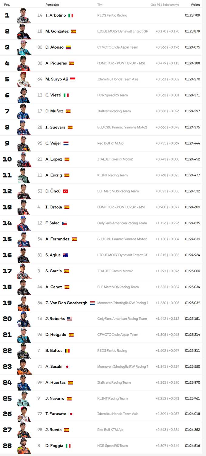 ![]() Pebalap Reds Fantic Racing, Tony Arbolino, sukses mencatatkan waktu tercepat dalam sesi Practice Moto2 Brasil 2026 di Autodromo Internacional Ayrton Senna, Goiania, pada Sabtu (21/3/2026) dini hari WIB. Pebalap asal Italia tersebut tampil sebagai yang terdepan dalam sesi yang berlangsung dengan persaingan ketat. Ia mampu menunjukkan performa yang konsisten sepanjang jalannya sesi, sehingga berhasil menempati posisi teratas. Kecepatannya di lintasan menjadi tolok ukur bagi para pebalap lain yang berusaha mendekati catatan waktunya. Di posisi kedua, Manuel Gonzalez yang membela Liqui Moly Dynavolt Intact GP berhasil menempatkan dirinya sebagai pesaing terdekat. Ia menunjukkan performa yang solid dengan menjaga konsistensi lap, sehingga mampu bertahan di posisi atas sepanjang sesi berlangsung. Manuel Gonzalez mampu menjaga jarak yang kompetitif dari pebalap terdepan dengan catatan waktu yang cukup impresif. Kecepatannya menunjukkan bahwa ia memiliki potensi untuk bersaing lebih jauh, terutama jika mampu meningkatkan detail kecil dalam setiap lap yang dijalani di lintasan. Sementara itu, posisi ketiga berhasil diamankan oleh David Alonso yang memperkuat CFMoto Aspar Team. Ia menunjukkan performa yang tidak kalah kompetitif dengan mampu menembus tiga besar di tengah persaingan yang berlangsung sengit di antara para pebalap. David Alonso tampil dengan ritme balapan yang cukup stabil sehingga mampu mempertahankan posisinya di papan atas. Catatan waktunya memperlihatkan bahwa ia memiliki kemampuan untuk terus bersaing, sekaligus menjadi ancaman bagi pebalap di depannya jika berhasil menemukan peningkatan performa. Untuk posisi keempat, Ángel Piqueras dari QJMotor Frinsa MSI berhasil mengamankan tempatnya dengan performa yang cukup solid. Ia mampu menjaga konsistensi waktu lap sehingga tetap berada dalam kelompok pebalap teratas sepanjang sesi berlangsung. Ángel Piqueras menunjukkan bahwa dirinya mampu bersaing di level atas dengan menjaga ritme yang stabil. Meskipun belum menembus tiga besar, ia tetap berada dalam posisi yang strategis untuk meningkatkan peringkatnya pada sesi berikutnya jika mampu memperbaiki beberapa aspek performa. Di posisi kelima, Mario Aji yang membela Idemitsu Honda Team Asia melengkapi jajaran lima besar. Pebalap asal Indonesia ini tampil kompetitif dan mampu menjaga posisinya di tengah tekanan dari para pesaing di belakangnya. Secara keseluruhan, susunan lima besar ini menunjukkan betapa ketatnya persaingan yang terjadi di lintasan. Setiap pebalap memiliki catatan waktu yang relatif berdekatan, sehingga perubahan kecil dalam performa dapat berdampak besar terhadap posisi akhir dalam klasemen sesi tersebut. Hasil Practice Moto2 Brasil 2026 : ![]() Sumber : bola.net