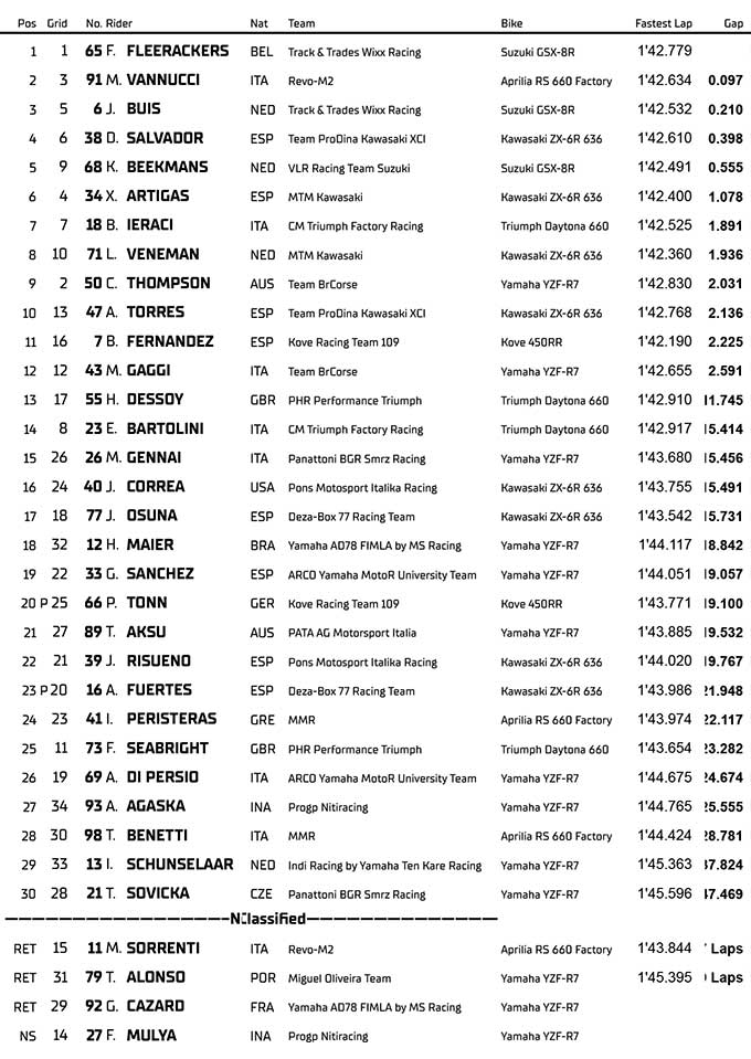 Meskipun demikian, Fleerackers mampu membalas di Tikungan 1 pada Lap 2 untuk merebut kembali posisi pertama. Elia Bartolini (CM Triumph Factory Racing) juga ikut bersaing di awal balapan, bertarung dengan dua pebalap Suzuki dan berada di posisi podium sementara. Pada Lap 4, Buis kembali merebut posisi pertama, sementara Fleerackers kehilangan momentum dan turun peringkat. Bartolini dan David Salvador (Team ProDina Kawasaki XCI) menjadi dua pebalap yang diuntungkan, tetapi Bartolini terjatuh di Tikungan 5 pada Lap 5. Pada Lap 10, bendera putih dikibarkan karena hujan mulai turun. Perebutan kemenangan berlangsung hingga lap terakhir, dengan Fleerackers meraih kemenangan dengan selisih 0,097 detik atas Matteo Vannucci (Revo-M2), sementara Buis melengkapi podium. Kemenangan Fleerackers berarti ia adalah pebalap Belgia pertama yang menang di paddock WorldSBK sejak Gauthier Duwelz di STK600, juga di Assen. HAMPIR SAJA: Lima pebalap terpaut 0,555 detik Salvador finis di posisi ke-4, sementara Kas Beekmans (VLR Racing Team Suzuki) meraih posisi kelima setelah diam-diam berjuang masuk ke kelompok terdepan. Pebalap Belanda itu hanya terpaut 0,555 detik dari kemenangan, sekaligus memastikan ketiga pebalap Suzuki finis di lima besar. Xavi Artigas (MTM Kawasaki) hanya terpaut sedikit lebih dari satu detik dari kemenangan, tetapi pebalap Spanyol itu harus puas dengan posisi ke-6. IERACI MENDAPATKAN POSISI KE-7: Mobil #18 berpeluang meraih podium hingga tahap akhir balapan. Bruno Ieraci (CM Triumph Factory Racing) sempat memimpin balapan tetapi kemudian turun peringkat dan finis di posisi ketujuh, terpaut delapan persepuluh detik dari Artigas di depannya. Loris Veneman (MTM Kawasaki) berupaya menebus kesalahan setelah tersingkir dari Balapan 1, dan pebalap bernomor #71 itu sempat berada di kelompok terdepan, tetapi kemudian turun peringkat dan finis di posisi kedelapan. Carter Thompson (Team BrCorse) menjadi pebalap Yamaha dengan posisi tertinggi di urutan kesembilan, sementara Antonio Torres (Team ProDina Kawasaki XCI), yang memimpin Kejuaraan sebelum Assen, finis di urutan ke -10 ; ia berhasil mengungguli Benat Fernandez (Kove Racing Team 109) di urutan ke-11 . CATATAN DARI BALAPAN KE-2: Beberapa peserta mengundurkan diri. Felix Mulya (ProGP NitiRacing) tidak memulai balapan. Gabin Cazard (Yamaha MS Racing FIMLA AD78) terjatuh di Lap 1 di Tikungan 8 dan pebalap Prancis itu mundur dari balapan. Tomas Alonso (Miguel Oliveira Team) terjatuh di Tikungan 7 pada Lap 5, sementara Fenton Seabright (PHR Performance Triumph) dan Mattia Sorrenti (Revo-M2) bertabrakan di Tikungan 5 pada Lap 6; Sorrenti terjatuh dari Aprilia-nya dan keluar dari persaingan. Pebalap Italia itu dibawa ke pusat medis untuk pemeriksaan. Insiden tersebut sedang diselidiki oleh Steward FIM WorldSBK. Bagi Seabright, itu adalah balapan yang buruk, karena ia harus menjalani tiga penalti Long Lap: ia diberi penalti Long Lap ganda karena berkendara tidak bertanggung jawab di Balapan 1, setelah bertabrakan dengan Veneman, sementara ia mendapat penalti lebih lanjut di Warm Up Minggu pagi; ia telah menyelesaikan ketiga penalti tersebut sebelum kecelakaan. Hasil Race 2 WorldSPB Belanda 2026 : ![]() Sumber : worldsbk.com