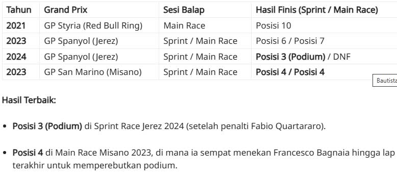 ![]() KTM sangat bergantung pada “feeling” Dani yang dikenal sangat presisi, sesuatu yang kerap dijadikan acuan utama sekaligus standar emas bagi para pebalap reguler mereka seperti Brad Binder maupun Pedro Acosta dalam mengembangkan performa motor serta menemukan setelan terbaik di berbagai kondisi lintasan sepanjang musim. Estafet ke Pol Espargaró Dengan mundurnya Dani dari tugas wild card, beban tersebut kini beralih sepenuhnya ke pundak Pol Espargaró. Pol, yang sempat mengalami cedera parah sebelum akhirnya bertransformasi menjadi test rider, dinilai masih memiliki “api” kompetisi yang lebih besar untuk terjun langsung di tengah hiruk-pikuk balapan. Dani secara sadar memberikan ruang tersebut agar Pol bisa tetap menjaga ritme balapnya sekaligus memberikan data kompetisi yang berharga bagi KTM. Catatan Penampilan Wild Card Dani Pedrosa bersama KTM ![]() Selama masa baktinya sebagai pebalap penguji, Dani beberapa kali turun sebagai wild card dan selalu berhasil membuat decak kagum karena kecepatannya yang tetap kompetitif meski sudah lama pensiun dari balapan reguler. Berikut adalah rangkumannya: ![]() ![]() Penampilan di Misano 2023 dan Jerez 2024 menjadi bukti sahih bahwa secara skill, Dani Pedrosa sebenarnya masih sangat mampu bersaing di level top. Namun, bagi sang Samurai, tugas utamanya kini adalah memastikan motor yang ia kembangkan bisa membawa pebalap muda KTM menjadi juara dunia. Terima kasih, Dani, atas hiburan luar biasa di setiap jatah wild card-mu! Sumber : tmcblog.com