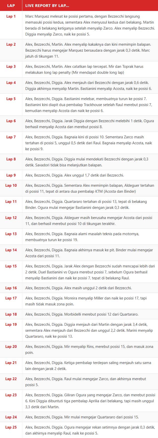![]() Sirkuit Jerez kembali membara.. di bawah langit biru yang cerah, pertarungan sengit di atas aspal kering Spanyol akhirnya melahirkan sang jawara baru. Balapan MotoGP Spanyol 2026 menghadirkan duel sengit sejak awal hingga lap terakhir. Rider asal Spanyol, Alex Marquez, sukses mengunci kemenangan bersama BK8 Gresini usai mencatat waktu tempuh 40:48.861. Keunggulannya lumayan, meskipun Marco Bezzecchi terus menekan dan finis kedua terpaut +1.903 detik. Catatan waktu ‘Bez’ dengan Fabio Di Giannantonio (Pertamina VR46) selisih +3.893 yang merebut posisi ketiga. Selisih ini menegaskan bahwa perebutan podium benar-benar berlangsung ketat. Persaingan di barisan berikutnya terlihat berat. Jorge Martin mengamankan posisi keempat dengan gap +9.229 detik dari pemenang, disusul Ai Ogura (Trackhouse Racing) yang hanya terpaut +0.662 detik di belakangnya. Sementara itu, Raul Fernandez (TrackHouse Racing) menuntaskan balapan di posisi keenam dengan selisih +10.614 detik. Rentang waktu yang rapat menunjukkan betapa konsistensi dan momentum keluar tikungan menjadi faktor pembeda di lintasan Spanyol kali ini. Tak kalah seru, pertarungan posisi tujuh hingga sepuluh juga berlangsung ketat. Johann Zarco (LCR Honda Castrol) finis ketujuh, diikuti rider Tech3 KTM, Enea Bastianini di posisi kedelapan dengan gap yang sangat dekat.. Dari Spanyol, pebalap muda Fermin Aldeguer berhasil membawa pulang hasil yang cukup kompetitif dalam balapan tersebut dengan mengamankan posisi kesembilan. Ia mencatatkan selisih waktu +19.778 detik dari pebalap terdepan, menunjukkan bahwa dirinya masih mampu bersaing di tengah ketatnya kompetisi Moto2 yang berlangsung di lintasan tersebut. Performa yang ditunjukkan oleh Fermin Aldeguer sepanjang balapan cukup konsisten, meskipun ia harus menghadapi tekanan dari para pebalap lain yang juga berusaha menembus posisi sepuluh besar. Dengan catatan waktu +19.778 detik, Aldeguer mampu mempertahankan ritmenya hingga garis finis tanpa melakukan kesalahan besar yang merugikan posisinya. Sementara itu, persaingan untuk melengkapi posisi sepuluh besar juga tidak kalah menarik, karena banyak pebalap yang saling berebut posisi di lap-lap akhir. Pada akhirnya, posisi kesepuluh berhasil diamankan oleh pebalap asal Spanyol lainnya, yaitu Pedro Acosta, yang menutup daftar sepuluh besar dalam balapan tersebut. Pedro Acosta menunjukkan kemampuan balap yang solid sepanjang perlombaan, meskipun harus puas berada di posisi terakhir dalam jajaran sepuluh besar. Ia tetap mampu menjaga performanya agar tidak terlempar dari kelompok depan, sekaligus memastikan dirinya finis di posisi yang masih memberikan hasil positif. Dengan keberhasilan Fermin Aldeguer dan Pedro Acosta menembus sepuluh besar, Spanyol kembali menunjukkan dominasinya dalam ajang balap Moto2. Kedua pebalap tersebut mampu bersaing dengan para rival dari berbagai negara dan membuktikan kualitas mereka di lintasan yang penuh tantangan tersebut. Hasil ini sekaligus mencerminkan betapa ketatnya persaingan di kelas Moto2, di mana selisih waktu antar pebalap bisa menjadi faktor penentu posisi akhir. Baik Fermin Aldeguer maupun Pedro Acosta berhasil memanfaatkan peluang yang ada untuk mengamankan tempat mereka di dalam sepuluh besar klasemen balapan. Jalannya Balapan Per-Lap : ![]() Hasil Race MotoGP Spanyol 2026 : ![]() Sumber : ridertua.com